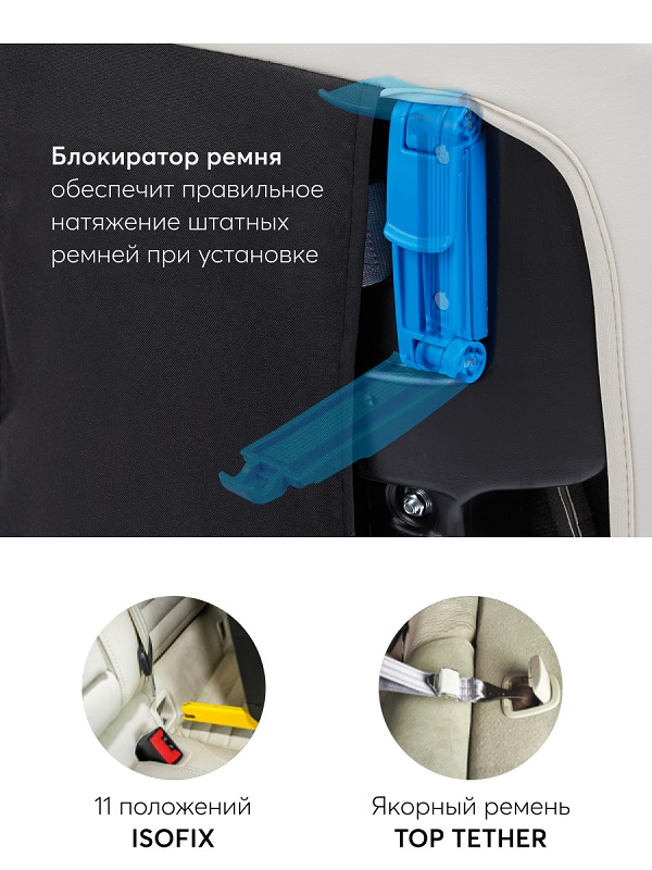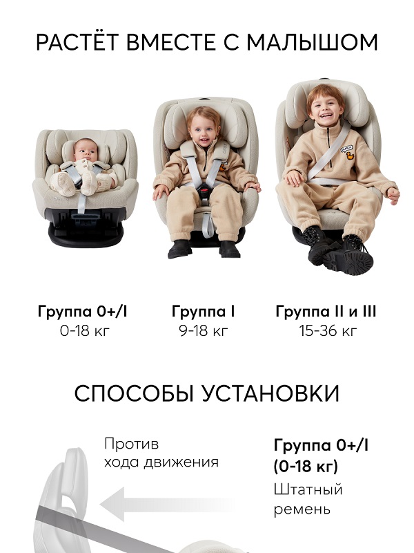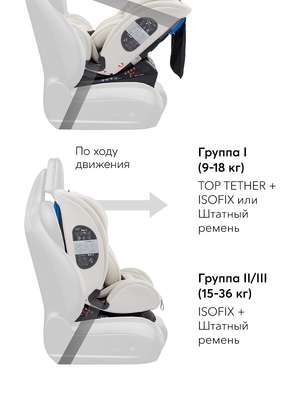 Установка по ходу движения возможна с помощью системы изофикс + якорный ремень или с помощью штатного автомобильного ремня (для ребенка от 9 до 36 кг).