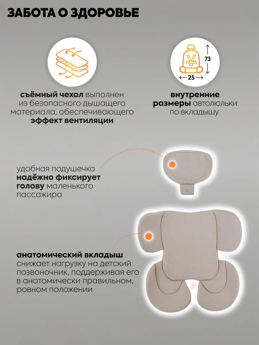 Для комфорта новорожденного предусмотрен съемный анатомический вкладыш. Он поддерживает новорожденного со всех сторон, обеспечивая максимальный комфорт и безопасность. Подголовник регулируется по высоте, позволяя настраивать кресло под рост ребенка. Удобные 3-х точечные ремни безопасности оснащены индикатором, который обеспечит дополнительный контроль безопасности.