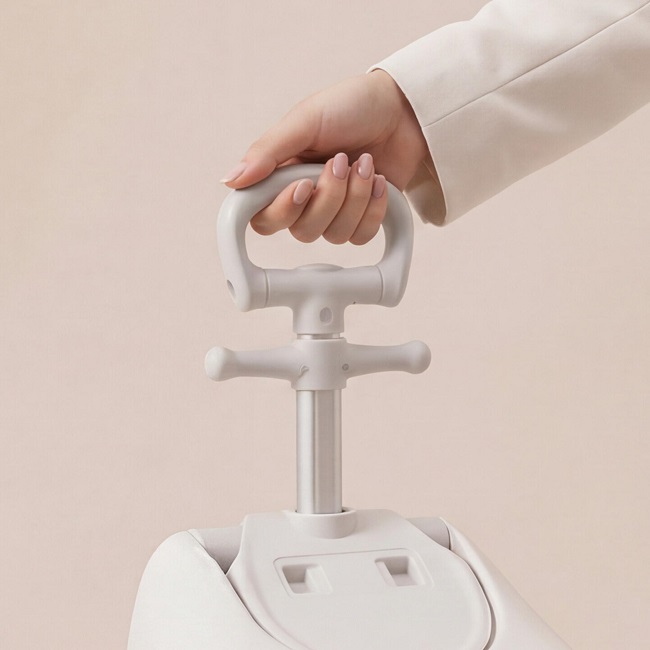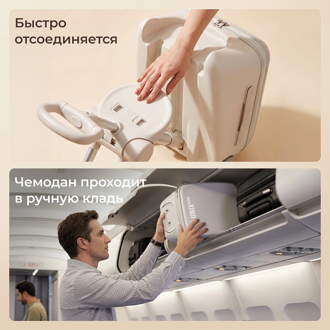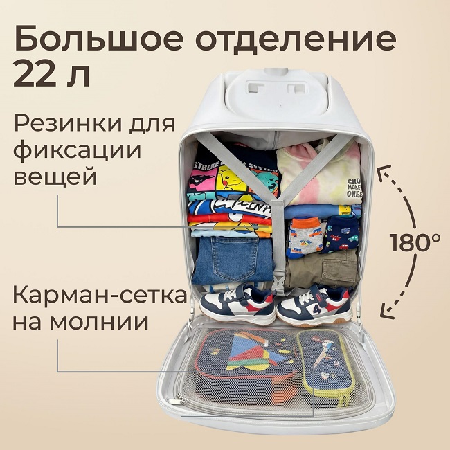 Чемодан на колесах соответствует нормам ручной клади. Это настоящая находка для путешествий на самолете. Можно взять с собой все необходимое для малыша: от одежды до перекуса, и быть уверенным, что чемодан пропустят в салон. Вес — 4,2 кг. Расположить чемодан на верхней полке несложно. При этом алюминиевая рама конструкции способствует устойчивости тележки с чемоданом и снижает риск опрокидывания.
