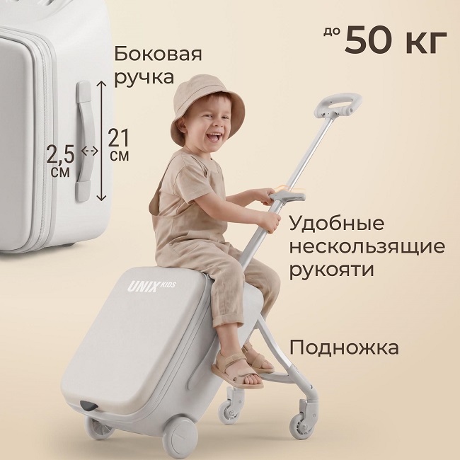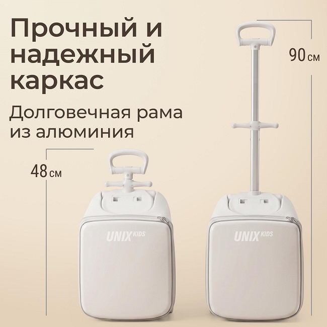 Чемодан - каталка — это свобода передвижения, комфорт для всей семьи. Путешествуйте легко, наслаждайтесь каждым моментом! Модель сертифицирована, имеет официальную гарантию 2 года. Конструкция рассчитана на годы активного использования — даже если вы путешествуете каждые пару месяцев. Отдыхайте вместе с UNIX Kids!