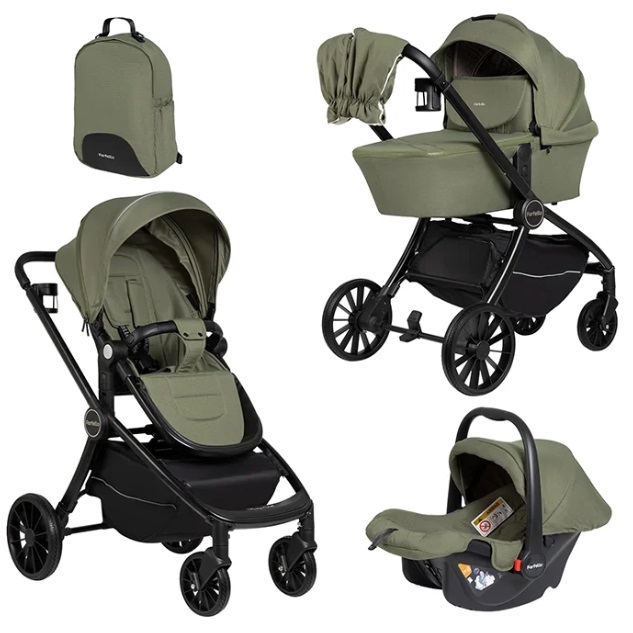 Коляска состоит из спальной люльки для малыша с рождения, прогулочного блока и автокресло 0+. Каждый модуль устанавливается на раму коляски в 2-х направлениях относительно дороги ( по ходу и против хода движения). Выбор модуля и его направление зависит от возраста ребенка.