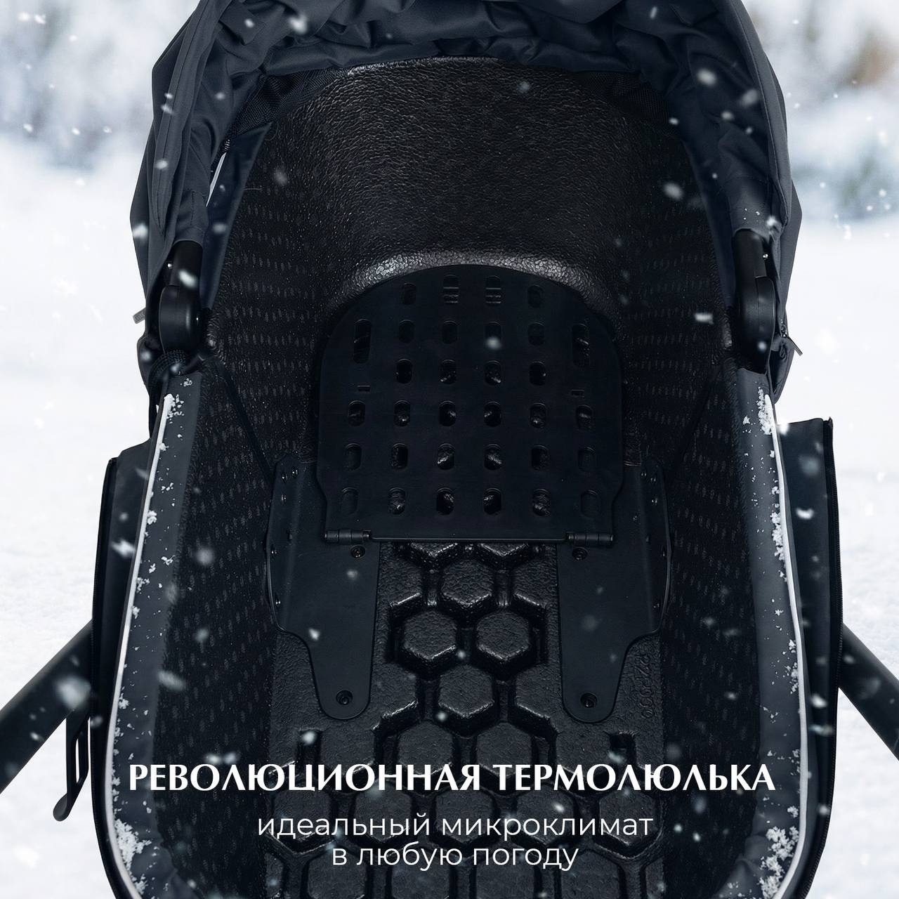 - Интеллектуальный климат‑контроль в люльке. Большая просторная термолюлька люлька (86х46х66 см) обеспечивает оптимальную температуру внутри, она обладает отличной теплоизоляцией, малышу комфортно в любых погодных условиях и служит барьером от внешнего мира:
