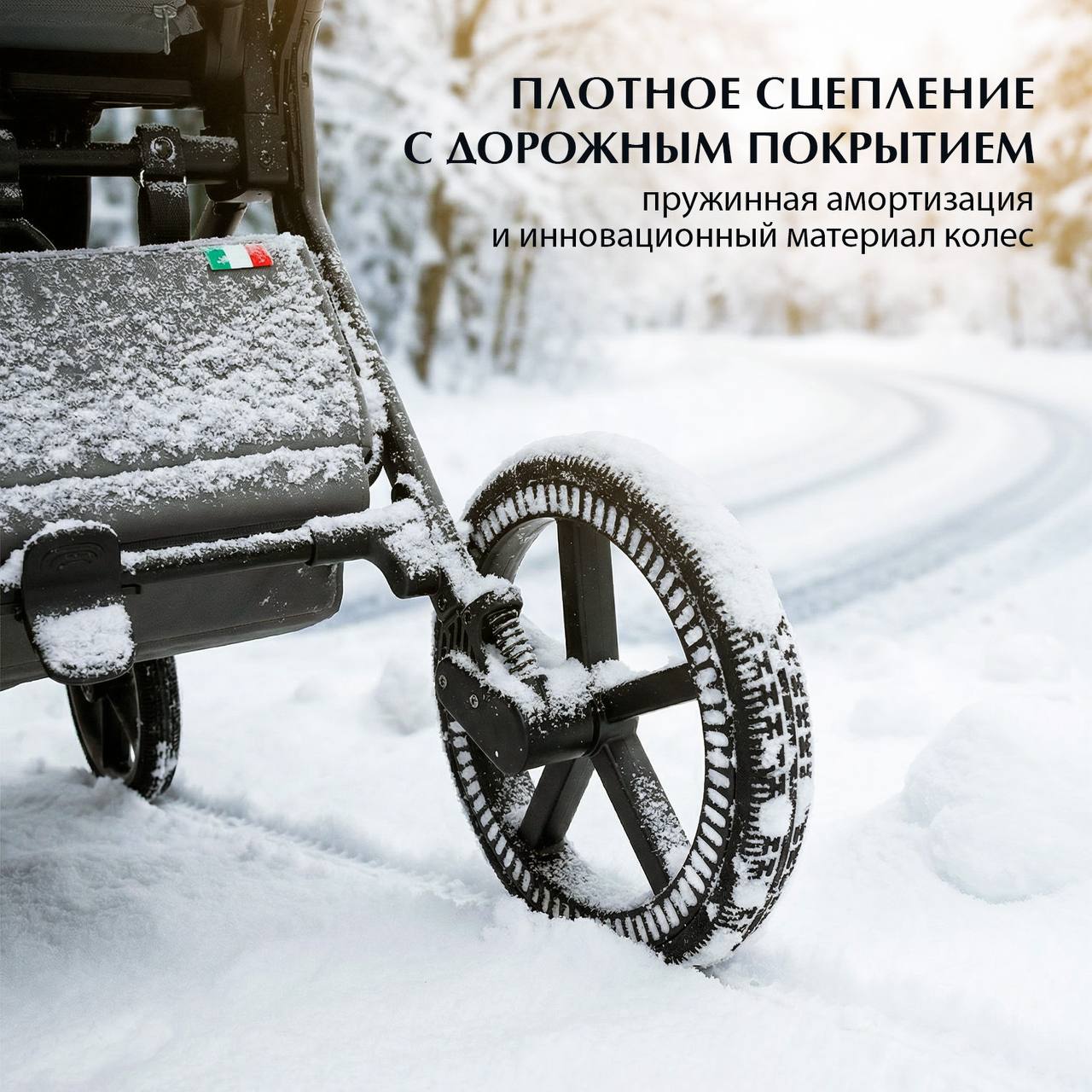 - Плавный ход на любом покрытии. Увеличенные колёса из высокомолекулярного сшитого полимера: