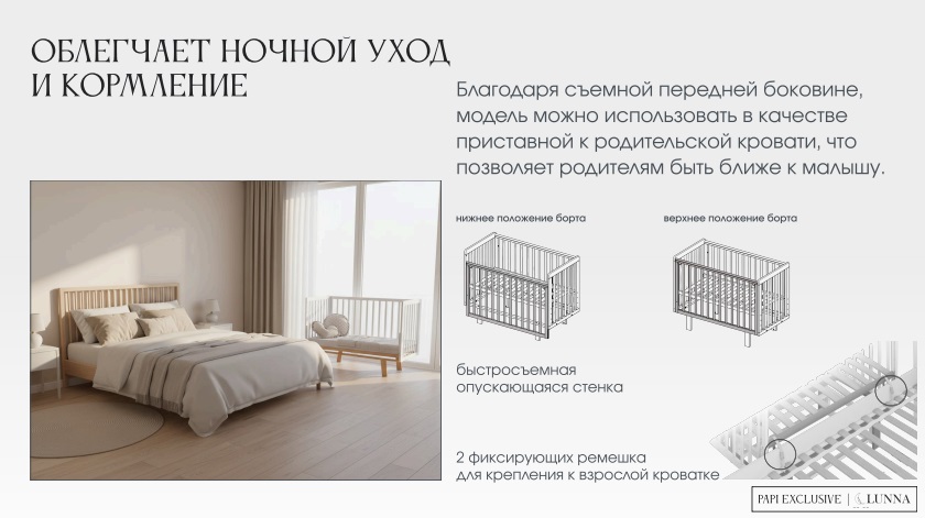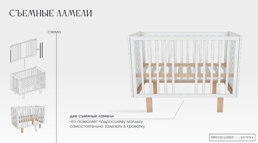 - Быстросъемный бортик, чтобы превратить кровать в диван или приставную кровать.