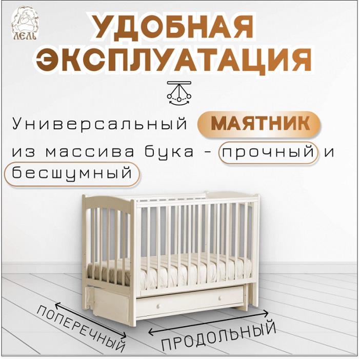 Кровать Кубаночка-3 оснащена универсальным маятником. Родители при сборке кровати могут выбрать продольное или поперечное движение. Маятник сделан из древесины бука, он работает мягко, плавно и бесшумно, благодаря металлическому подшипнику конструкция прочная, не выйдет из строя. Фиксатор при необходимости обеспечит неподвижность кроватки.