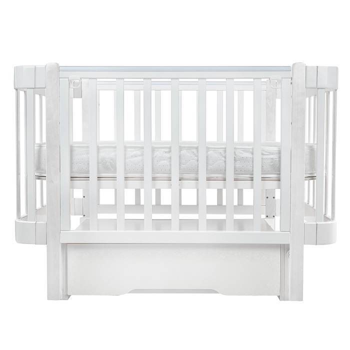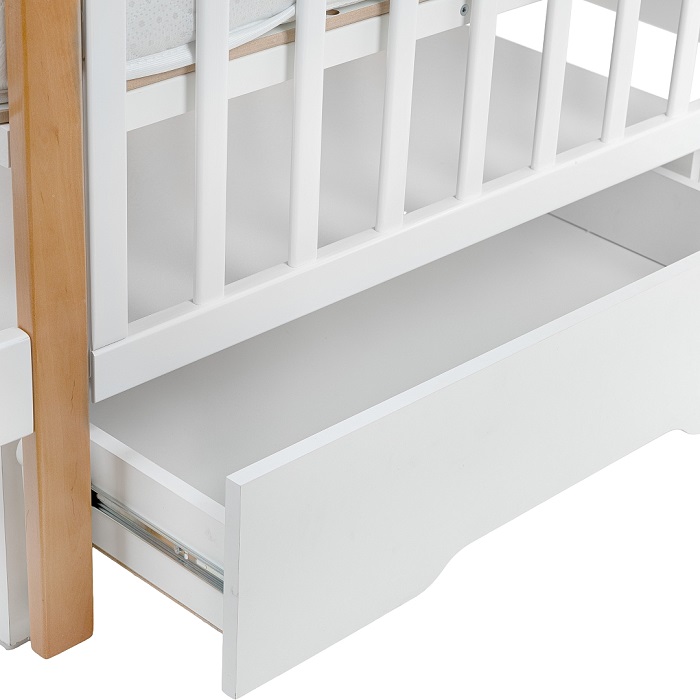Благодаря передней, легкосъемной стенки, кроватка буквально за считанные секунды может превратиться в диванчик или приставную модель, для сна рядом с родителями. Под кроваткой размещен вместительный ящик, который позволит удобно хранить все спальные принадлежности для малыша, в том числе конверт, бортики, одеялки.