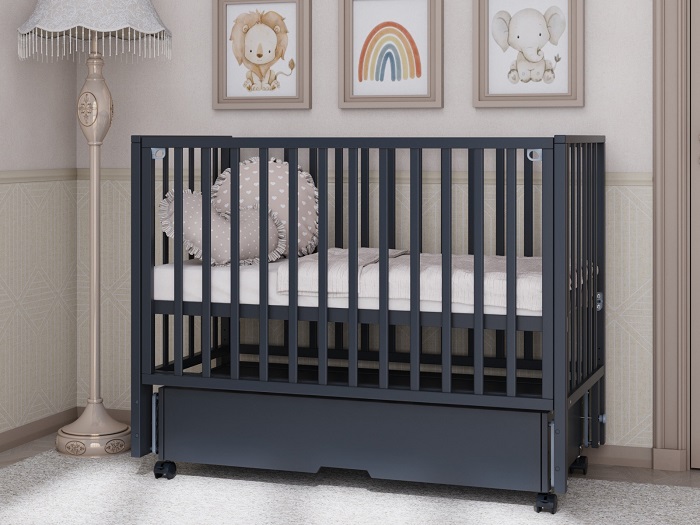 Вместительный ящик под кроваткой позволит удобно хранить детские вещи, например одеялки, пледики, бортики и тд. Ящик удобно выдвигается и задвигается, не тревожа сон ребенка.