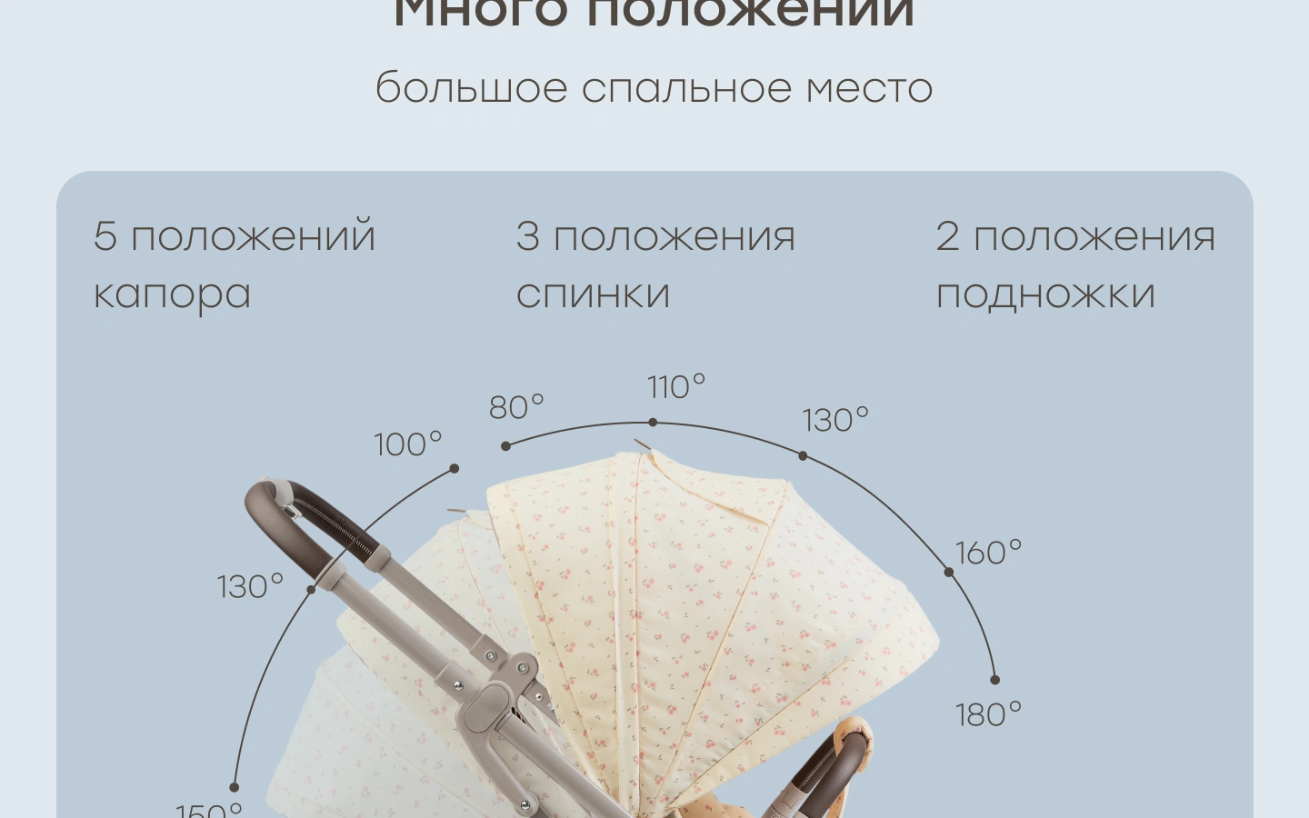 Для комфорта ребенка в коляске предусмотрено просторное спальное место с механической регулировкой спинки и подножки. Ребенок сможет полноценно спать в коляске во время длительной прогулки. За безопасность ребенка отвечают 5-ти точечные ремни безопасности с магнитным замком, который позволит быстро пристегнуть непоседу и отправиться на прогулку. Капюшон с расширением до бампера надежно укроет от любой непогоды, создаст атмосферу для сна и отдыха, создаст тень во время жаркого дня.