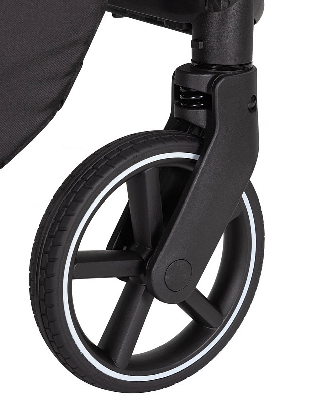 Коляска оснащена большими резиновыми ненадувными колесами с высоким профилем. Они не сдуваются и требуют дополнительного сервисного обслуживания. Каждое колеса оснащено амортизацией, в задней части коляски предусмотрено переключение жесткости хода. Коляска уверенно пройдет по бездорожью, проедет по снегу, песку. Передние колеса с автоматической фиксации в положении "прямо", фиксируются флажком под подножкой.
