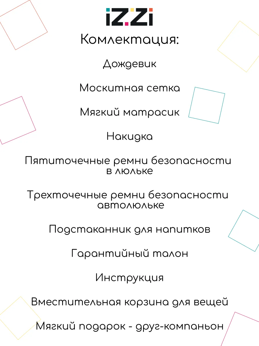 У коляски большая комплектация: в коляску все необходимое для комфортной прогулки в любую погоду. Милым и оригинальным "сюрпризом" станет игрушка-компаньон Мимоши. Игрушка попадается рандомно и даже мы не знаем игрушка попадется вашему малышу.