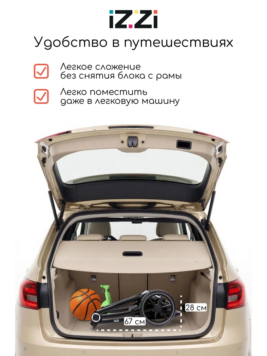 Izzi - это легкая коляска, которая полностью разобранная из коробки, легко собирается за 5 минут ; компактно складывается для поездок или путешествий; с которой просто везде и всегда.