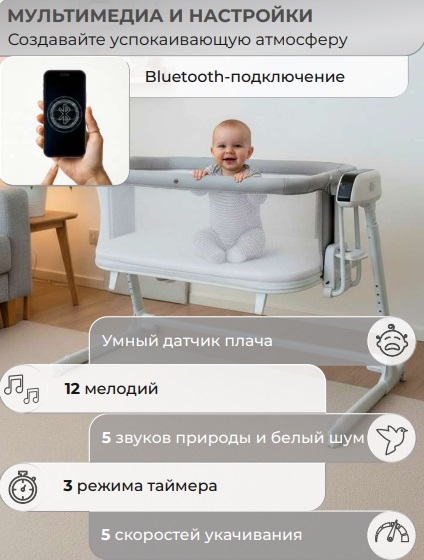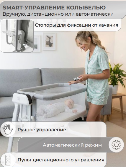 - Умный датчик плача автоматически запускает укачивание, если малыш проснулся. Вы можете расслабиться и отдохнуть, зная, что ребёнок под контролем.