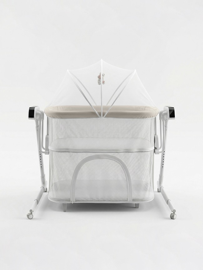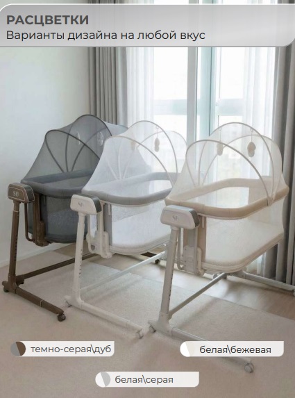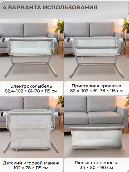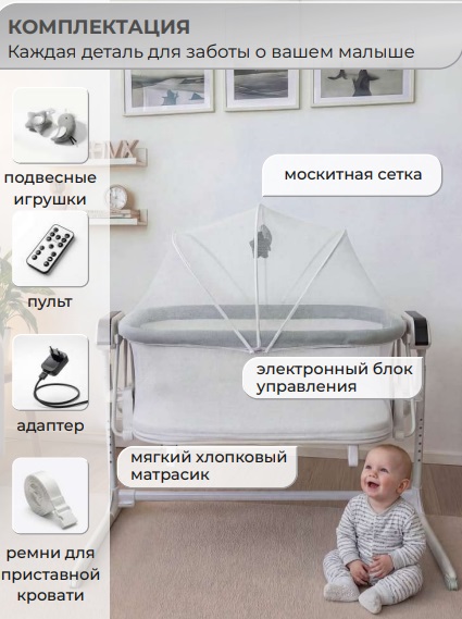 В комплекте: пульт ДУ, адаптер, москитная сетка, 2 подвесные игрушки, мягкий хлопковый матрасик, электронный блок управления, ремни для приставной кровати.