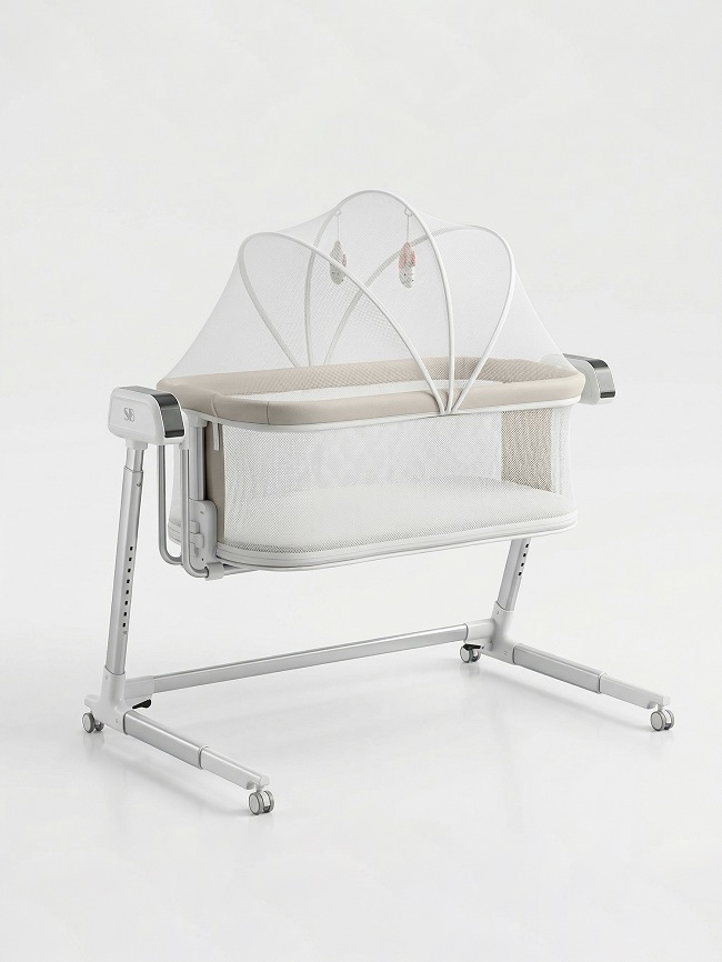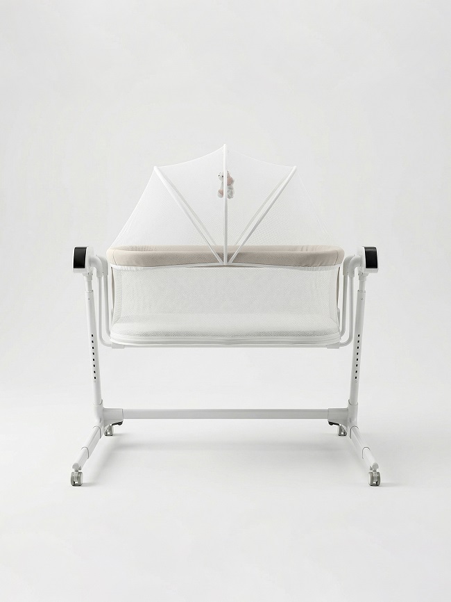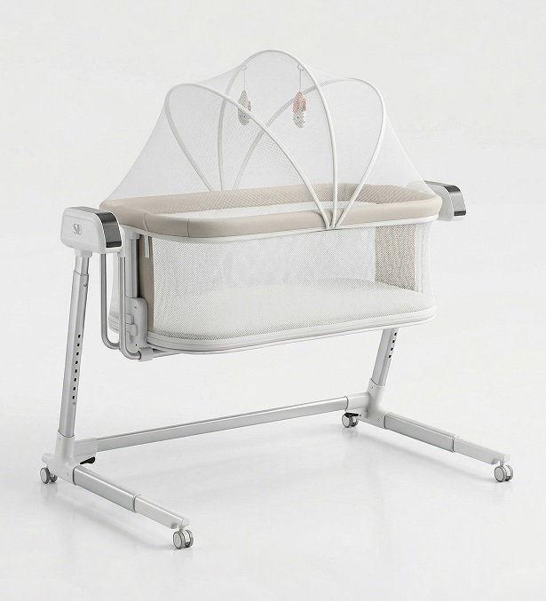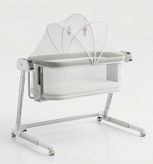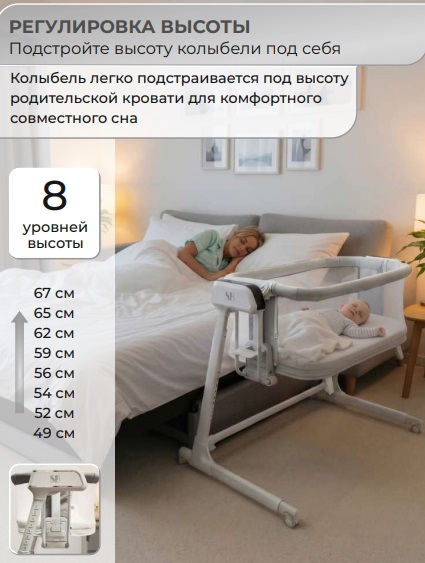 - 8 положений регулировки высоты позволяют настроить колыбель под родителей любого роста, а также превратить ее в приставную кроватку, подобрав идеальное расположение рядом с родительской кроватью.