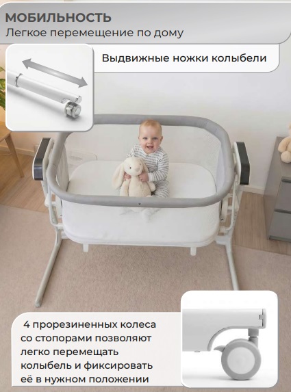 - 4 прорезиненных колеса со стопорами обеспечивают мобильность и дают возможность легко перемещать колыбель по дому и фиксировать в нужном положении.