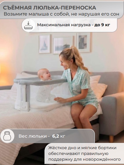 - приставная кроватка - безопасный совместный сон: колыбель надёжно крепится к родительской кровати, благодаря ремням-фиксатором, идущим в комплекте, исключая риск падения;