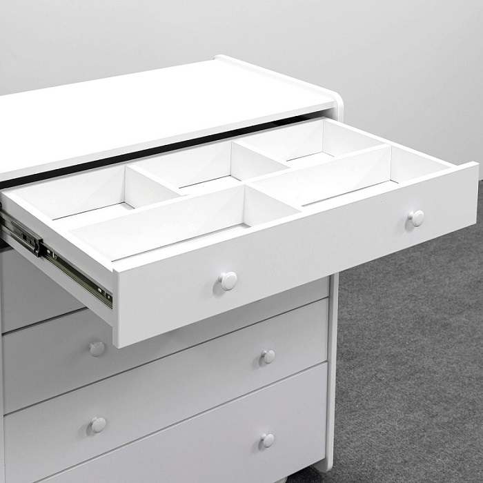 Комод Антеми Мари оснащен 5 вместительными ящиками. Каждый ящик оснащен направляющими для тихого хода и полного выдвижения. Верхний ящик поделен на секции, что позволит более удобно разместить маленькие вещи для ребенка и легче поддерживать порядок в полке.