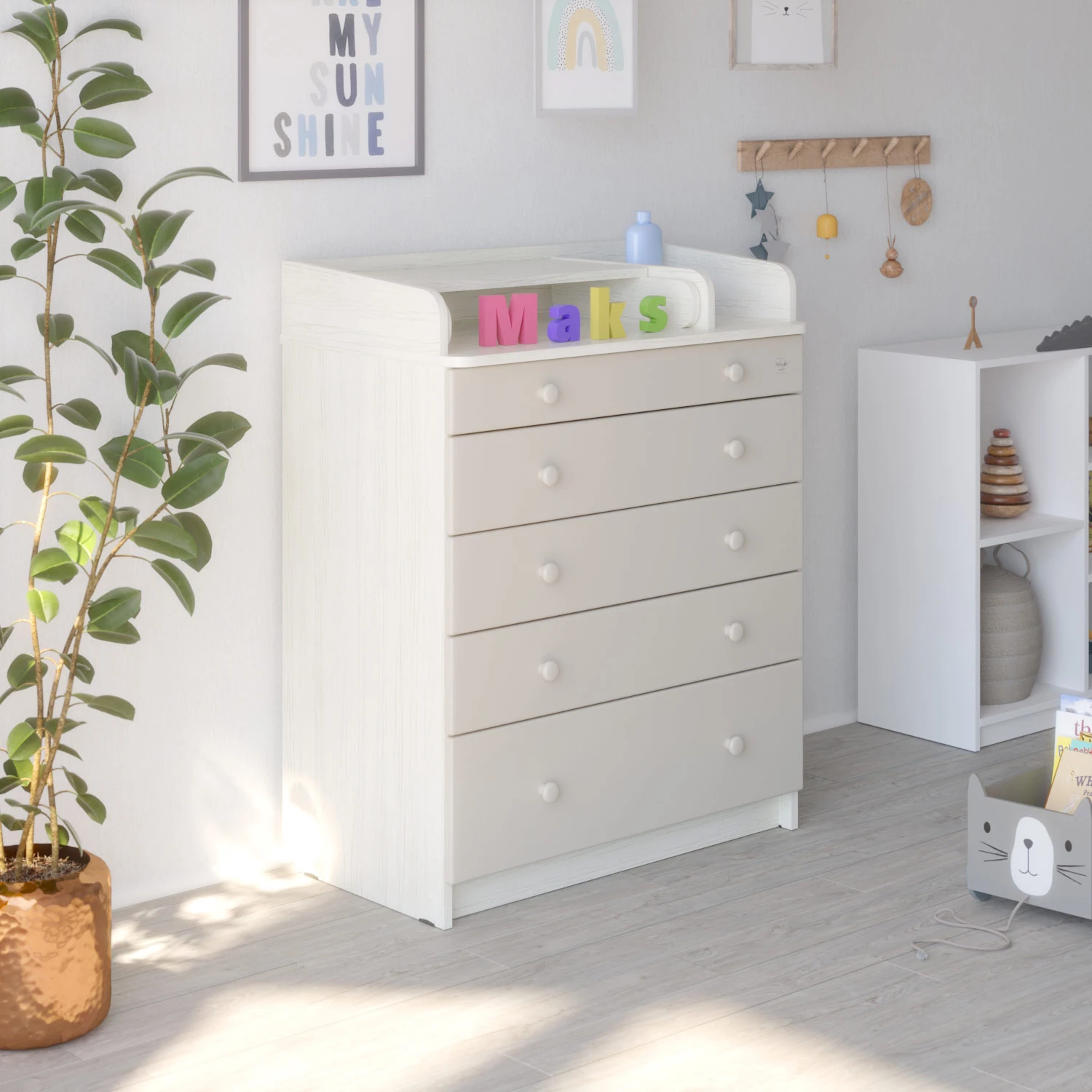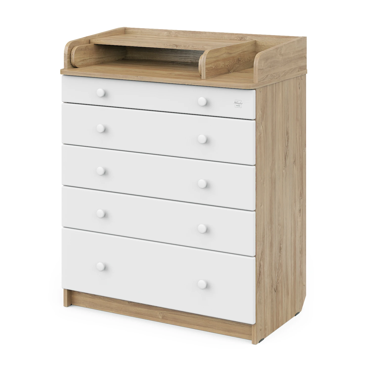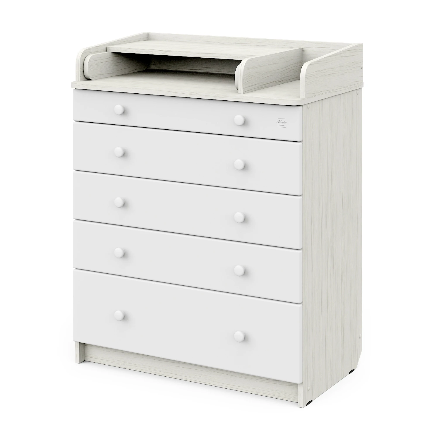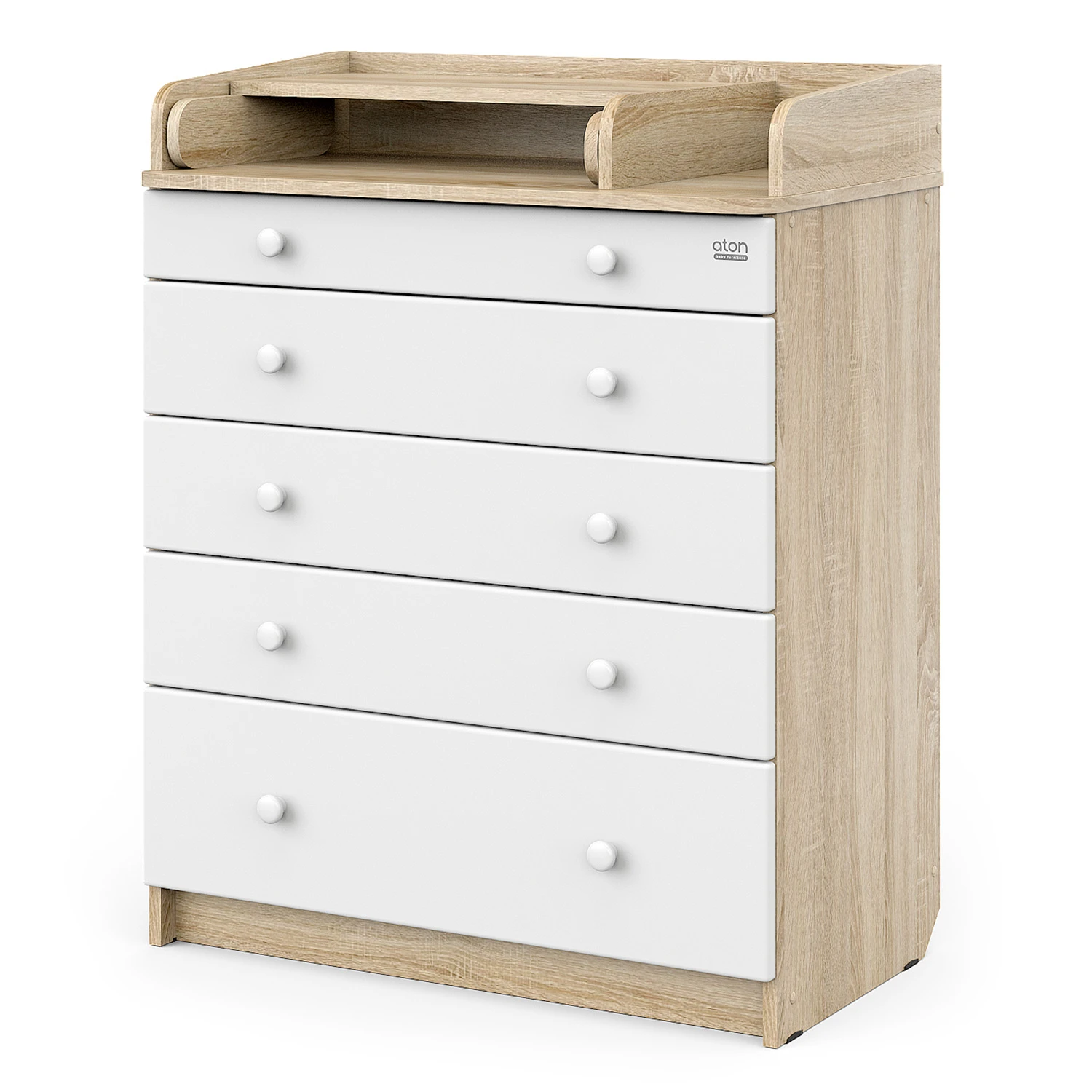 Комод Атон MAKS ЛДСП 800/5 (Атон Макс) - элегантный, выполненный в современном стиле и удобный пеленальный комод, в комбинациях контрастных оттенков благородной древесины с нежными, приятными на ощупь, белыми или бежевыми фасадами из МДФ с шариковыми направляющими.