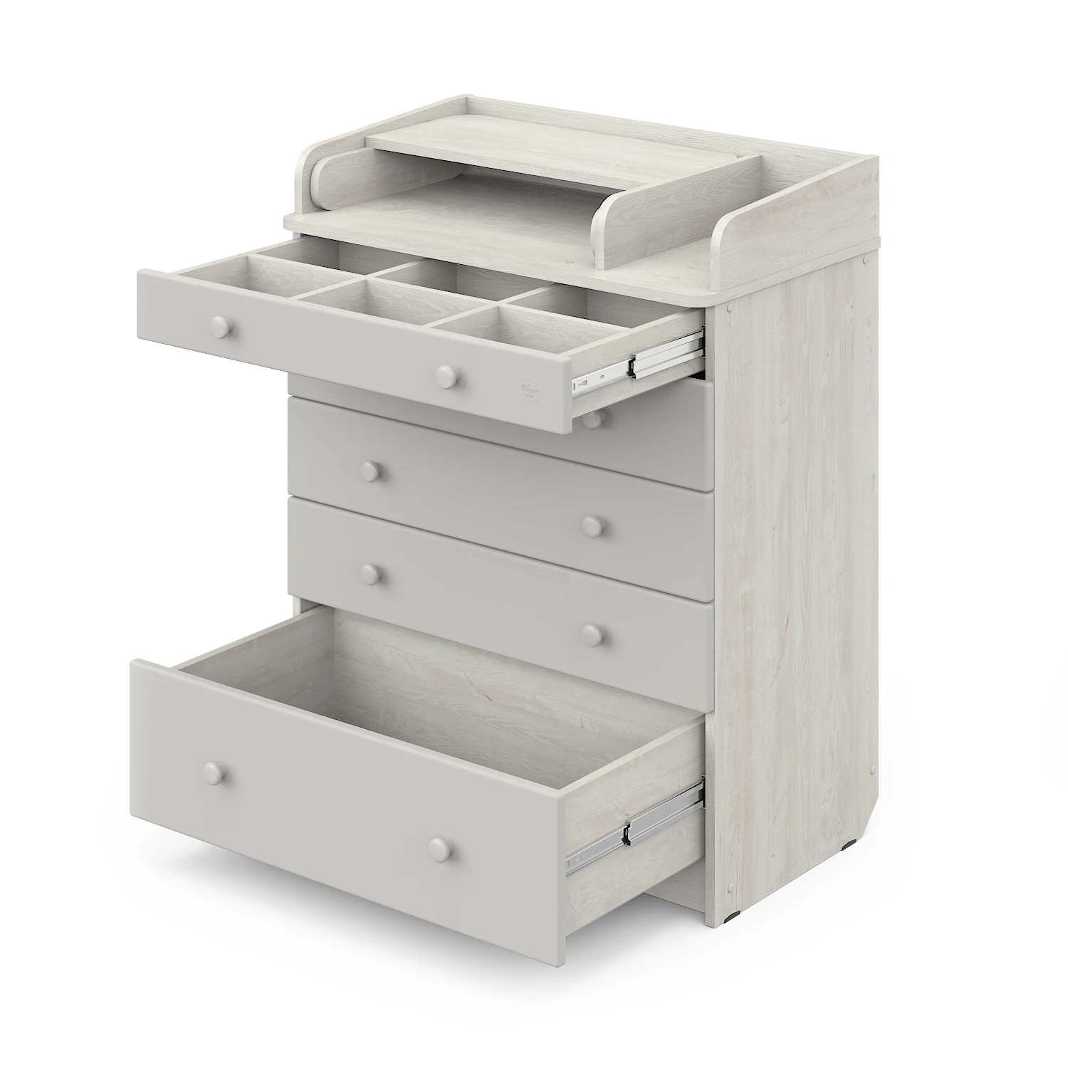 Комод очень вместительный благодаря пяти ящикам, которые установлены на надежные шариковые направляющие бесшумного хода. Нижний ящик большей глубины, а верхний с органайзером для удобства сортировки детских вещей (6 отделений). Глубина ящиков сверху вниз: 8,5 см, 10 см, 10 см, 10 см, 18,7 см.