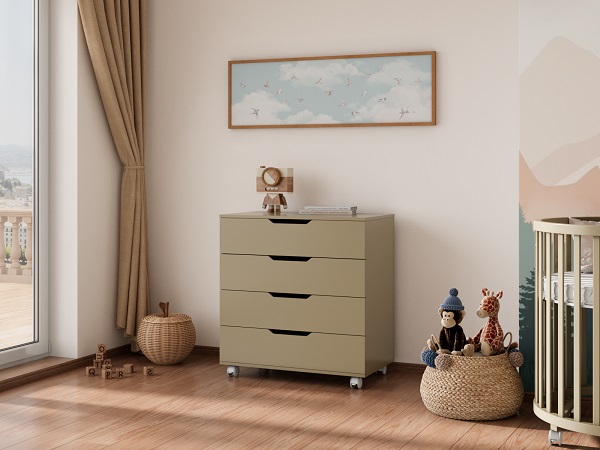 Комод оснащен 4 вместительными ящиками с удобными ручками-выемками. Такие ручки - это современное и безопасное решение для детской комнаты. Они смотрятся стильно и оригинально, при этом малыш не удариться об ручки и не прищемит себе пальчики.