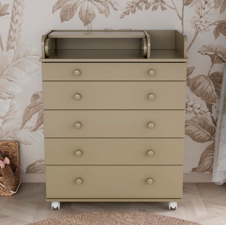На комоде расположен складной пеленальный столик, который в сложенном виде может использоваться как дополнительные полочки. Рядом с пеленальным столиком есть удобное место для аптечки и гигиенических средств ребенка. В разложенном виде пеленальный столик очень удобен, имеет высокие бортики безопасности. Пеленальный столик позволит маме осуществлять все необходимые гигиенические процедуры для ребенка, переодевание, пеленание, на удобной для нее высоте.