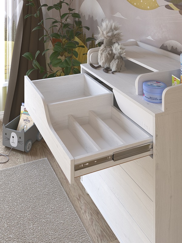 Интересным дизайнерским элементом является двухуровневый органайзер. Он позволит более удобно разместить небольшие вещи для малыша.