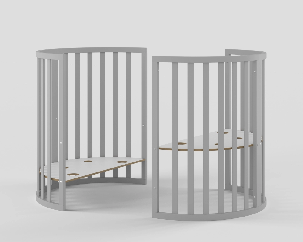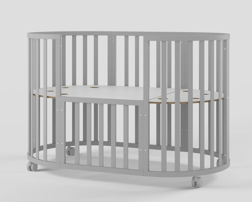 - Модель с различными вариантами трансформации: круглая кровать с пеленальным столиком, овальная кровать, манеж, приставная кровать, стол с креслами, кровать-диванчик.