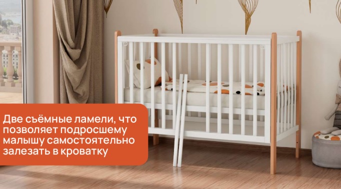 Благодаря съемным ламелькам, ребенок сможет сам залазить и вылазить из кроватки, когда подрастет.