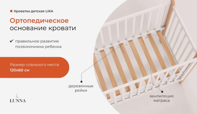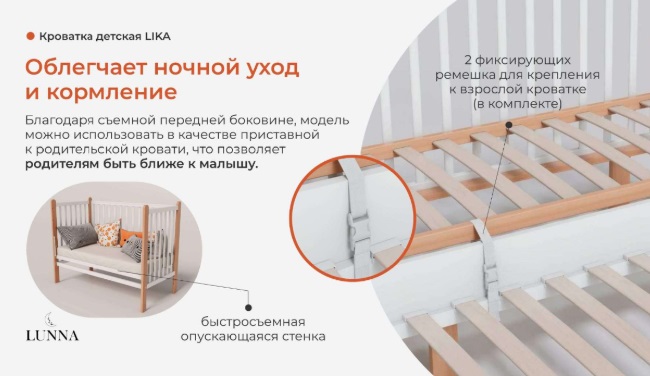 Кровать Лунна Лика можно использовать как приставную на ночной сон. Просто снимите передний бортик и зафиксируйте кроватку к взрослой с помощью специальных ремешков в комплекте. Малыш будет спать спокойнее и крепче рядом с родителями, а вам не придется вставать, чтобы проконтролировать сон ребенка.