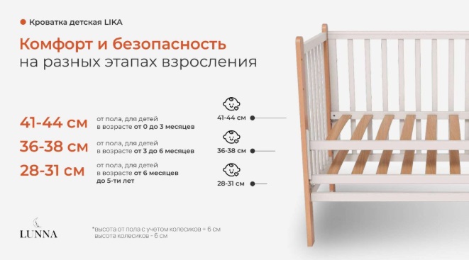 Кровать Lunna Lika Exclusive на ножках/колесиках (Лунна Лика) - детская кровать из массива березы с удобным функционалом, который упростит укладывание ребенка спать. В этой кроватки ни чего лишнего: стандартное спальное ложе с регулировкой по высоте, удобный быстросъемный бортик, колеса, которые позволят легко перемещать кроватку по комнате.