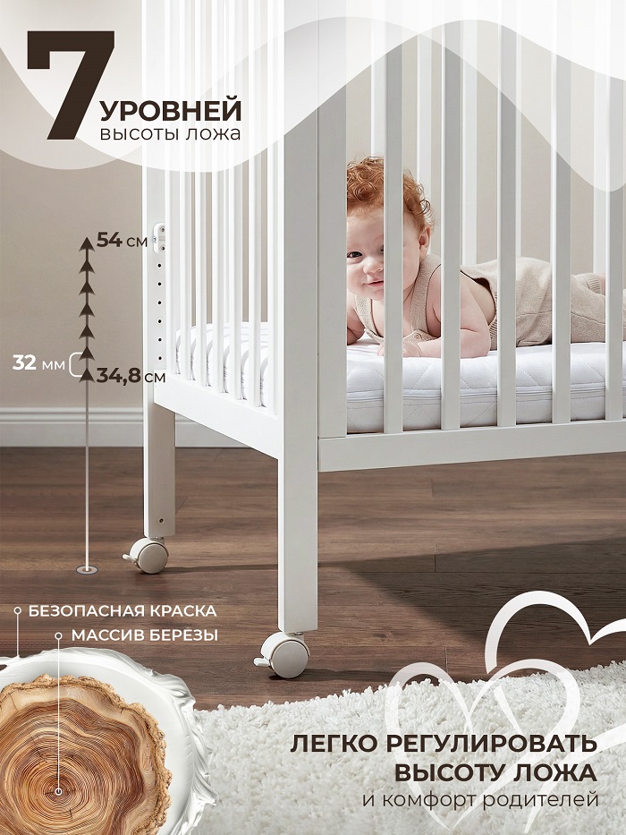 - Кроватка выполнена исключительно из высококачественных материалов, что гарантирует безопасность и долговечность;