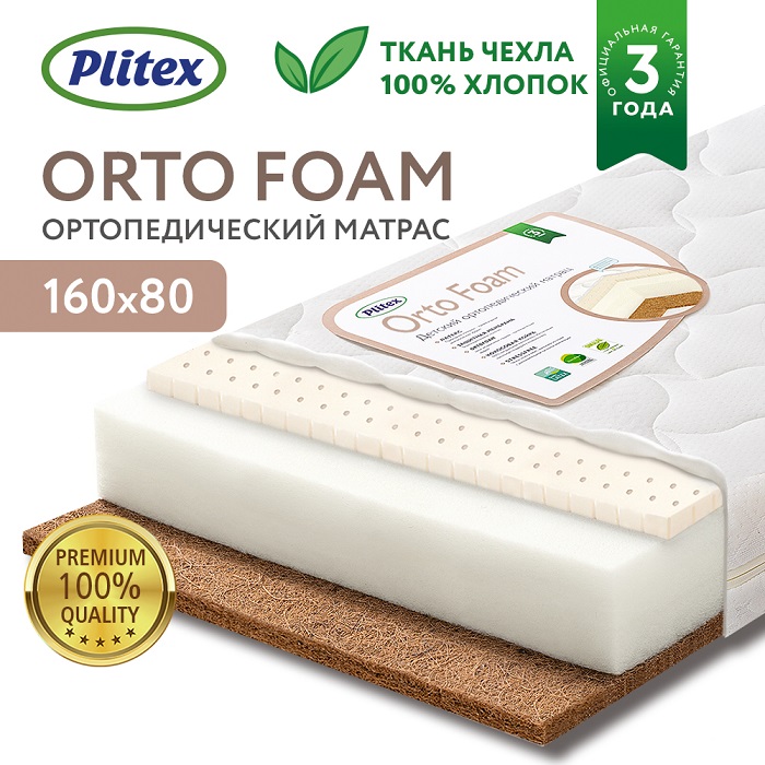 Матрас PLITEX Orto Foam (160х80х12см) - ортопедический беспружинный матрас на основе материалов повышенной упругости: ортопедической пены Ortofoam, натурального латекса и кокосовой койры. Модель разработана с участием детских врачей-ортопедов, адаптирована под ребенка от 3 до 7-10 лет. Подходит для спального места 160х80 см.