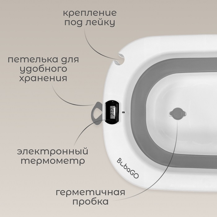 - Складная ванночка с встроенным термометром – обеспечивает точный контроль температуры воды, гарантируя безопасность и комфорт малыша.