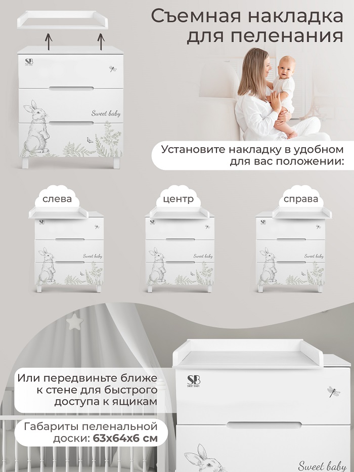 Пеленальный столик можно установить с любой стороны комода или посередине, образовывая удобную и безопасную поверхность для переодевания и пеленания ребенка. Когда столик станет неактуальным, он легко снимается, превращая комод в бельевой.