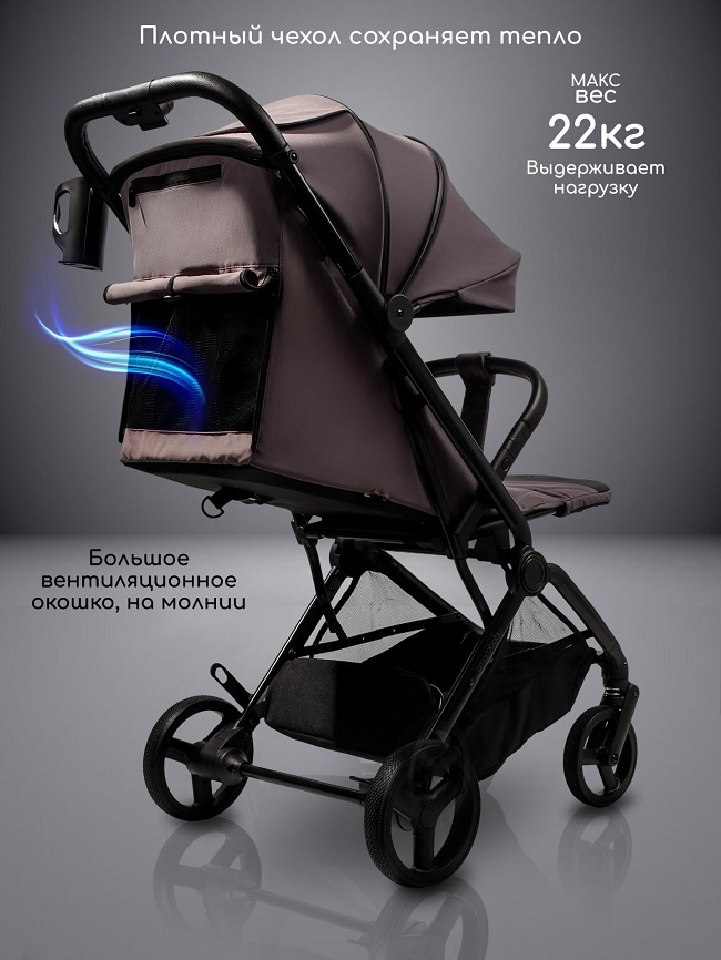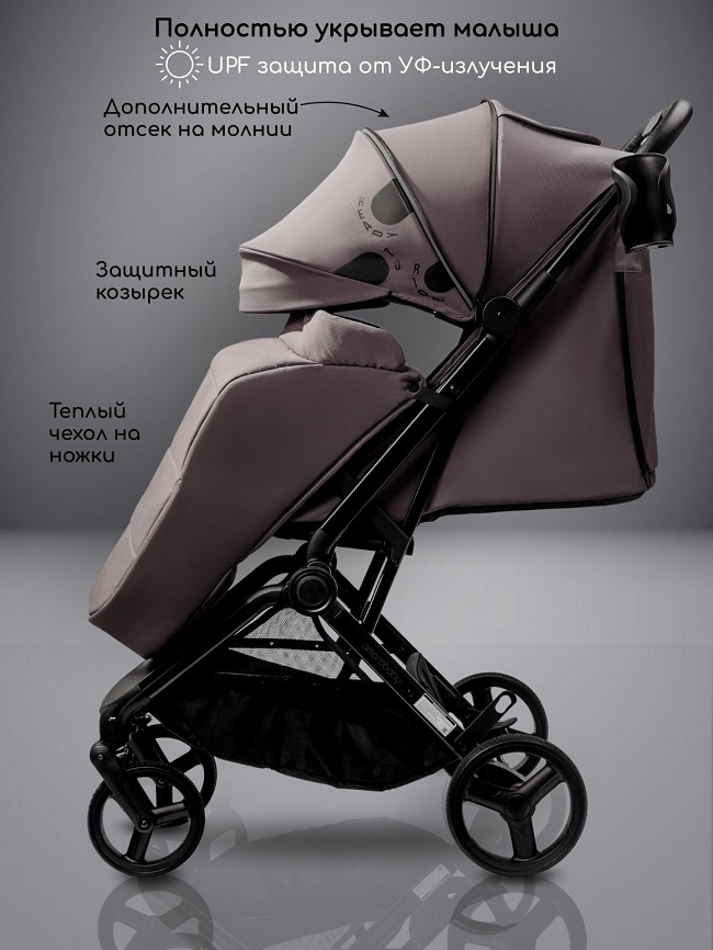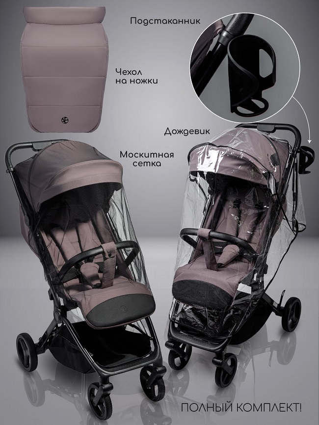 В комплекте с легкой коляской идет всё необходимое: влагонепроницаемый дождевик, москитная сетка, теплый чехол на ножки для прохладных дней и удобный подстаканник. Непревзойденную проходимость обеспечивают большие полиуретановые колеса размером 16/19 см, которые легко преодолевают любые препятствия. Передние колеса с возможностью блокировки гарантируют устойчивость и маневренность даже на сложных участках.