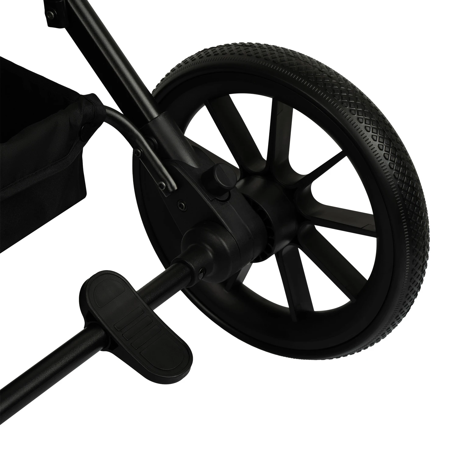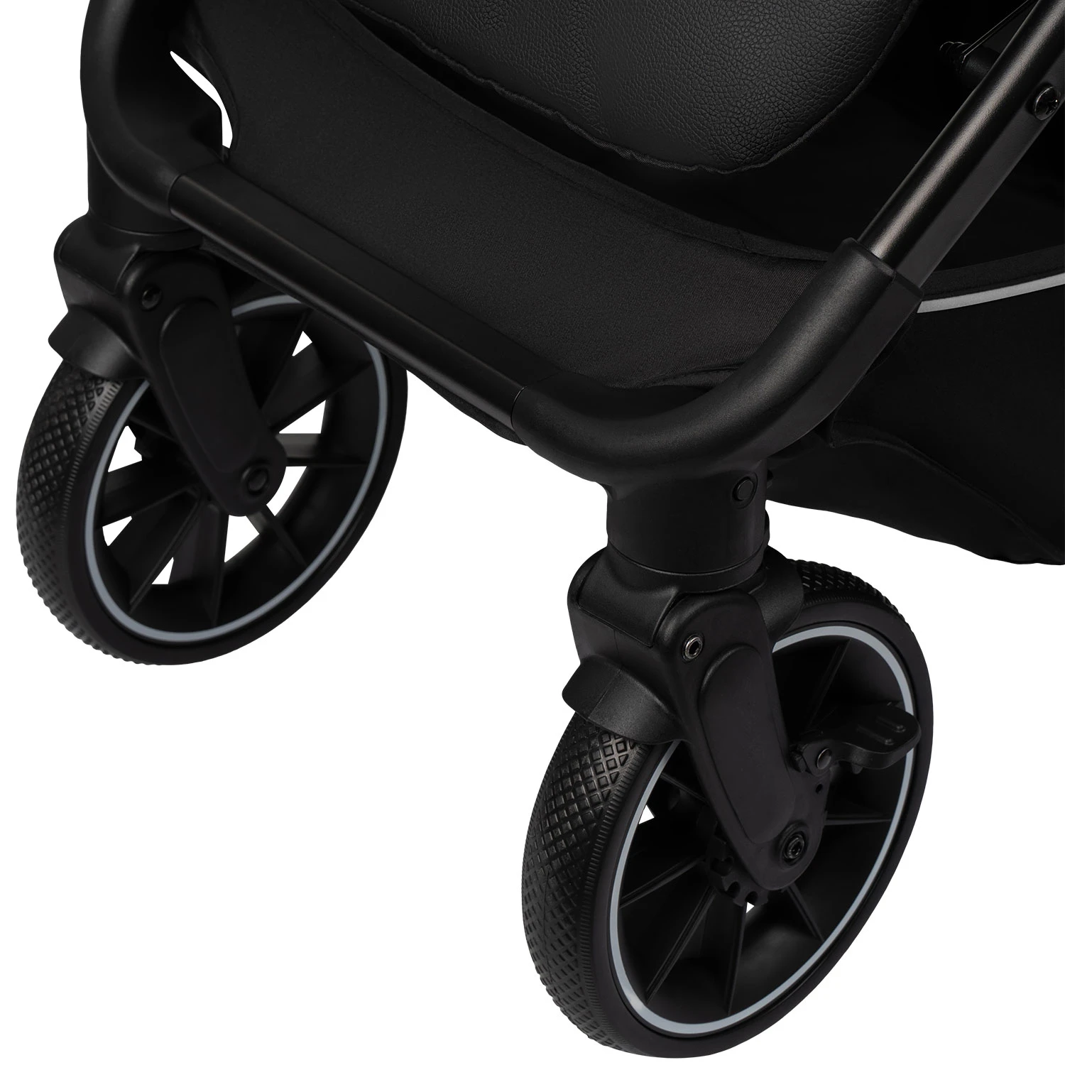 Современные непрокалываемые колеса Eva обладают стойкостью, долговечностью и простотой в обслуживании. Они легко справятся с неровностями дороги, не зависят от температуры на улице, не боятся проколов. Снимаются для ухода или более компактного хранения коляски. Передние поворотные колеса позволят легко управлять коляской, даже одной рукой.