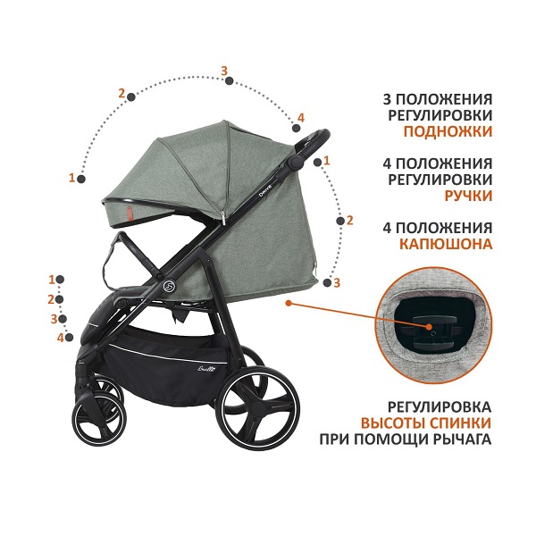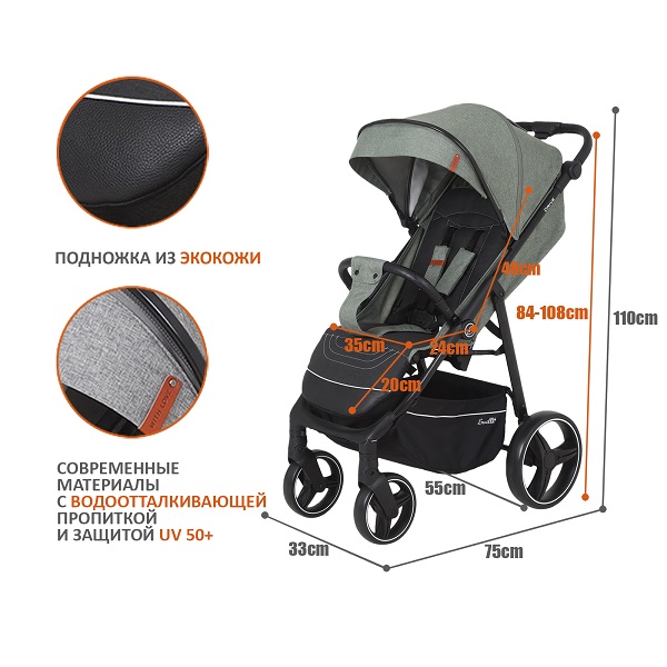 Коляска оснащена большим и просторным спальным местом 92х35 см. Плавная и тихая регулировка спинки позволит, не тревожа ребенка, опустить спинку до горизонтального положения, если малыш задремал на улице. Подножка поднимается, позволяя ножкам ребенка удобно лежать во время прогулки. Часть подножки выполнена из эко кожи и легко чистится после прогулки.