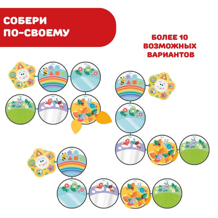 - 5 тканевых дисков (4 сезона и 1 радуга) с разными текстурами: каждый диск характеризуется особым стимулом, который помогает ребенку развить определенные навыки.