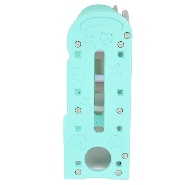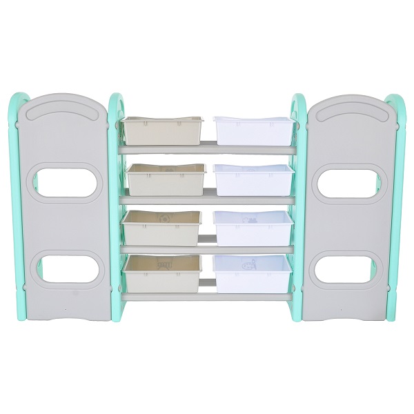 Стеллаж для игрушек с ящиками и полками выполнен из качественного пластика. Данный материал экологичен и прост в чистке. Небольшой вес стеллажа и его устойчивая конструкция обеспечивают ребёнку безопасность от ушибов.