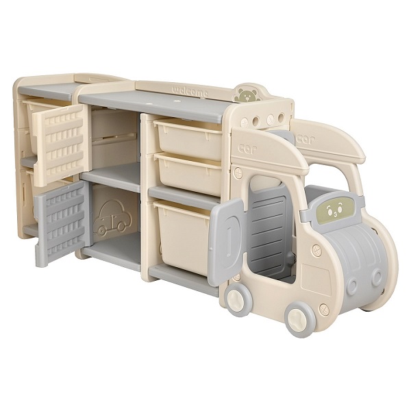 Интересным элементом стеллажа является машинка, которая отсоединяется от основных полок и может использоваться отдельно. Колеса у машинки крутятся, а дверь открывается.