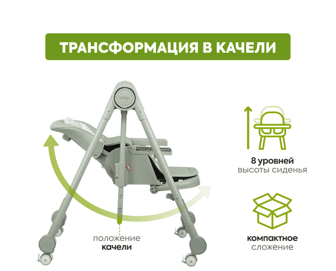 Стульчик легко настраиваться по высоте в 8 положениях, позволяя маме сделать кормление ребенка максимально удобным. Стульчик оснащён съемным столиком с пятью уровнями глубины и отдельным подносом для приема пищи. После кормления спинку стульчика легко наклонить для отдыха малыша.