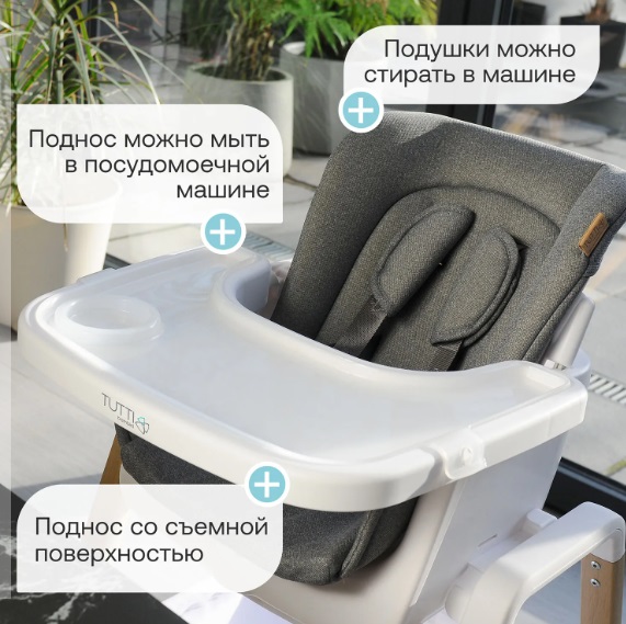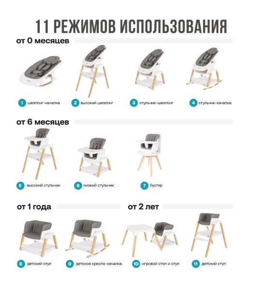 7 режимов использования, включая: стульчик для кормления, низкий стульчик, сиденье-бустер, кресло-качалка для малышей, стульчик для малышей, игровой стол и стульчик, детский стульчик