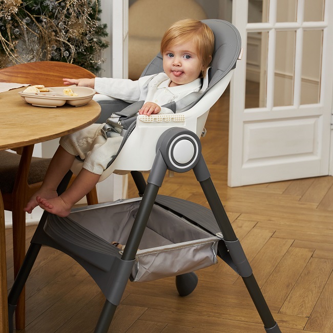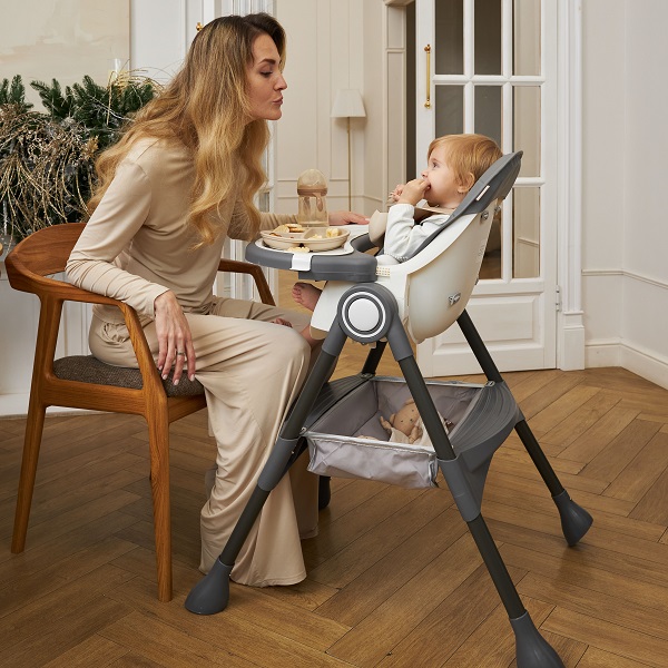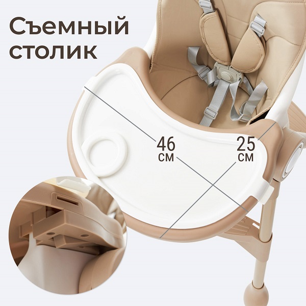 Дополнительные удобства обеспечиваются съемным органайзером для любимых игрушек ребенка, съемным столиком с регулировкой по глубине и дополнительным подносом-вкладышем, которые позволяют разместить необходимые предметы рядом с крохой, предотвращая хаос вокруг места приема пищи. Углубление под бутылочку гарантирует безопасность и удобство питья.