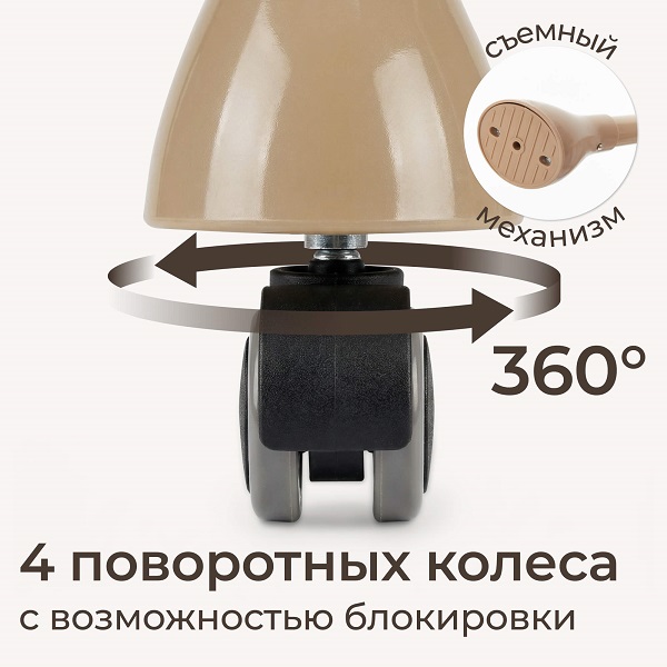 Мобильность в передвижении обеспечивается поворотными колесиками на 360 градусов, оснащенными функцией блокировки, что предотвращает случайное перемещение стула. Колеса выполнены таким образом, что не повреждают напольное покрытие, сохраняя эстетику интерьера.