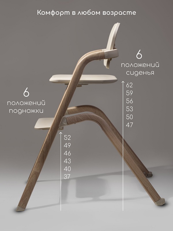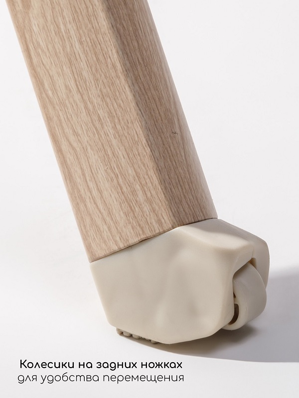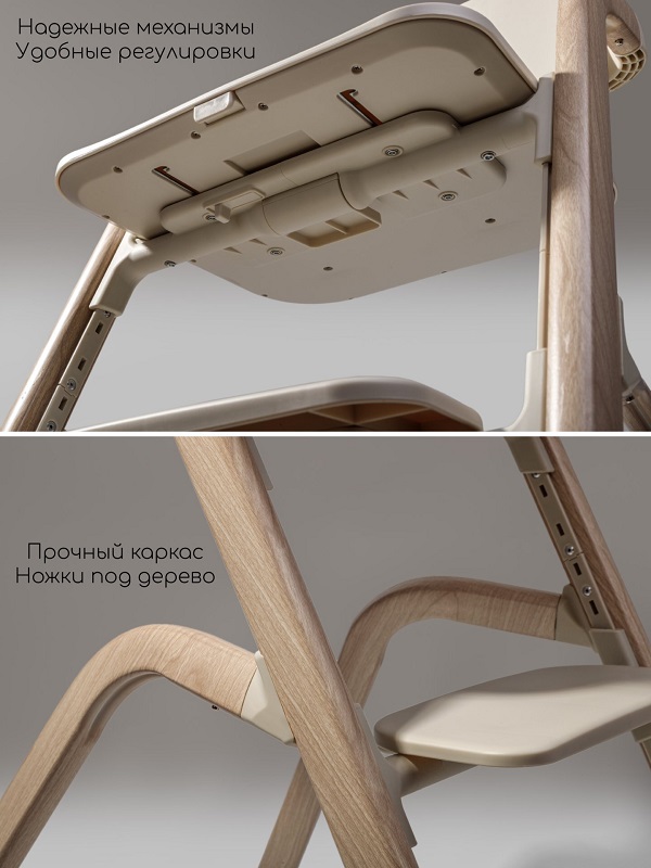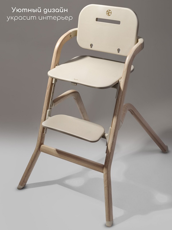 Прочный каркас стульчика обеспечит надежность и устойчивость конструкции. Металлические ножки выполнены под дерево, что придает стульчику теплоту и элегантность. На задних ножках предусмотрены колесики, которые позволят легко перемещать стульчик по дому.