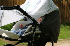 - защищайте малыша от воздействия прямых солнечных лучей. Накрываем капюшоном, ставим коляску в тенек. А если капюшон маленький – есть недорогое и дорогие стильные зонтики, тенты от солнечных лучей, даже пеленку можно натянуть от капюшона до родительской ручки (а не полностью все коляску).