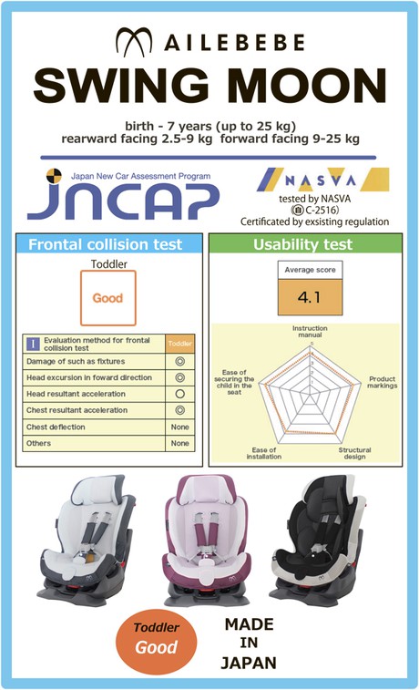 6. Безопасность. Независимая организация NASVA после проведенных испытаний оценила безопасность Carmate Swing Moon Premium как «Nopmal», что показывает отличную безопасность. Полностью соответствует Европейскому стандарту ЕСЕ R44/04.