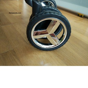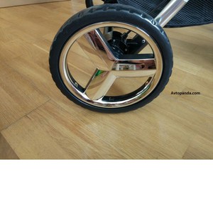 Колеса очень большие. Диаметр передних колес 18 см. , задних колес – 25 см. Не резиновые. Сдвоенные. Колеса были разработаны специально с 3 спицами, чтобы колесо не забивалось снегом, и созданы специально для езды по нашим никогда не чистящимся от снега тротуарам, дорогам с бордюрами и ухабами.