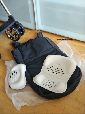 Коляска полностью собрана и готова к эксплуатации. Отдельно в пакете убраны аксессуары: теплый конверт на молнии черного цвета (независимо от цвета коляски), а так же Анатомический вкладыш DACCO.