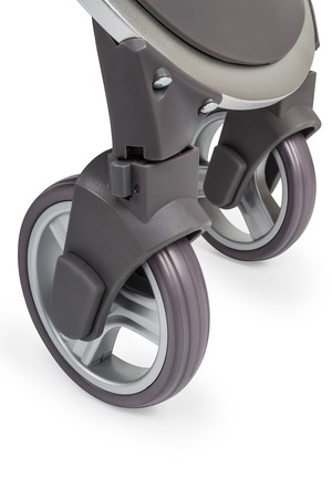 Колеса у коляски небольшие пластиковые с покрытием EVA . Задние колеса чуть больше передних, для большей проходимости. Передние колеса поворотные с возможностью фиксации. Коляска едет достаточно легко. Есть небольшая амортизация на передних и задних колесах. В городе, парках, магазинах, коляска будет отлично ездить без нареканий.